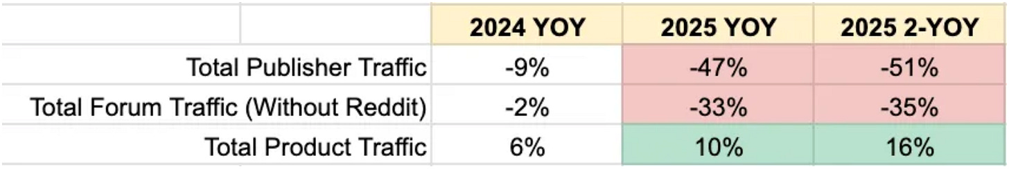 In my analysis from last month, publisher traffic is down 51% since 2023, and forums are down 35% (excluding Reddit). That is a massive shift from users getting answers on websites to getting answers from AI.